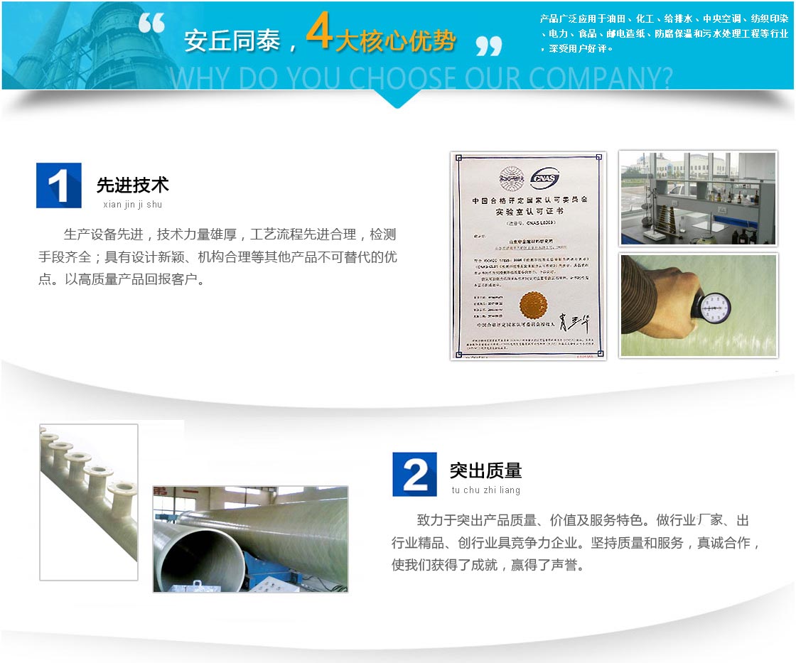 山東同泰玻璃鋼有限公司,位于世界風箏都濰坊市南30公里的安丘市經濟開發區同泰工業園,占地面積200畝,廠房面積12000平方米,擁有固定資產5860萬元,各種專業制造設備齊全先進。在公司企業文化的感召下,旗下凝聚了一大批有志于玻璃鋼產業的國內工程技術人才和的產業員工。是生產制造各種玻璃鋼系列產品和加工制造各種機械配件、定型不定型產品的大型專業制造商,年產值近3億元,成為當地政府民營骨干企業之一。 近年來,在公司戰略方針的指導下,同泰得到長足的發展,先后參入國內重大工程建設的配套生產,承攬了浙江二建援疆引水農田灌溉工程和當地市政工程-汶河南岸的倒虹吸工程等重大工程,深受政府稱贊。 本公司產品有:各種規格復合玻璃鋼管道、管件、夾砂管道、電纜管道、通風管道、壓力管道、玻璃鋼罐、儲存罐、運輸罐、化工設備罐、圓形...